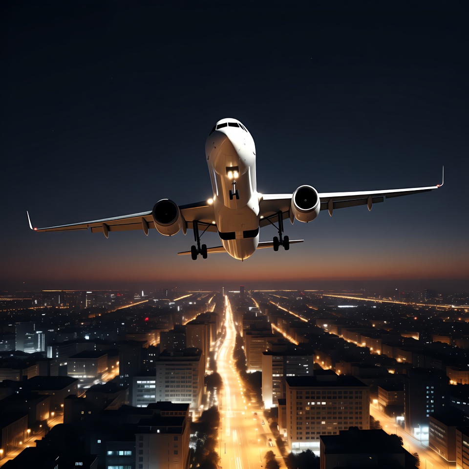 Airplane flying over city at night
