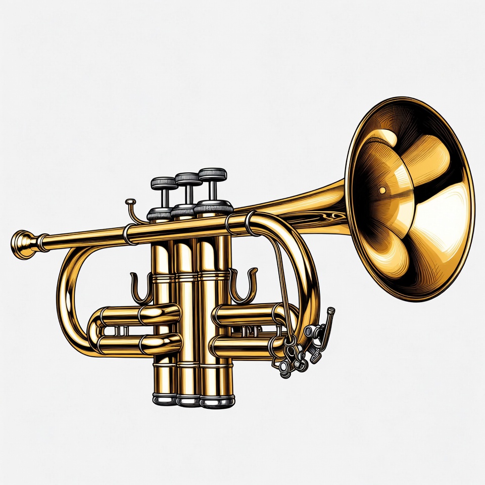 band instrument, brass instrument, clipart, flared bell, golden trumpet, illustration, isolated background, jazz trumpet, music, musical instrument, orchestral, shiny brass, trumpet valves, vector art, trumpet