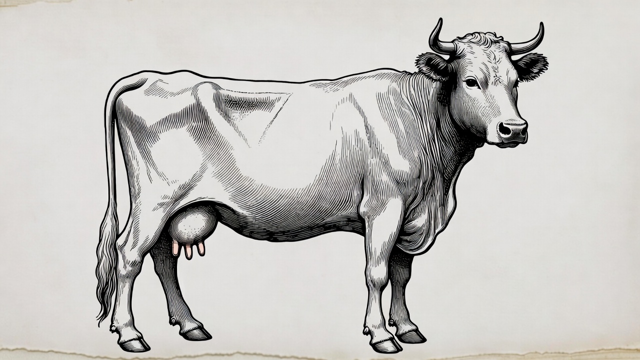 A detailed black and white illustration of a cow standing on a plain background. The cow has prominent horns, a visible udder with teats, and a tail hanging down. The sketch features fine line work highlighting the animal's anatomy.