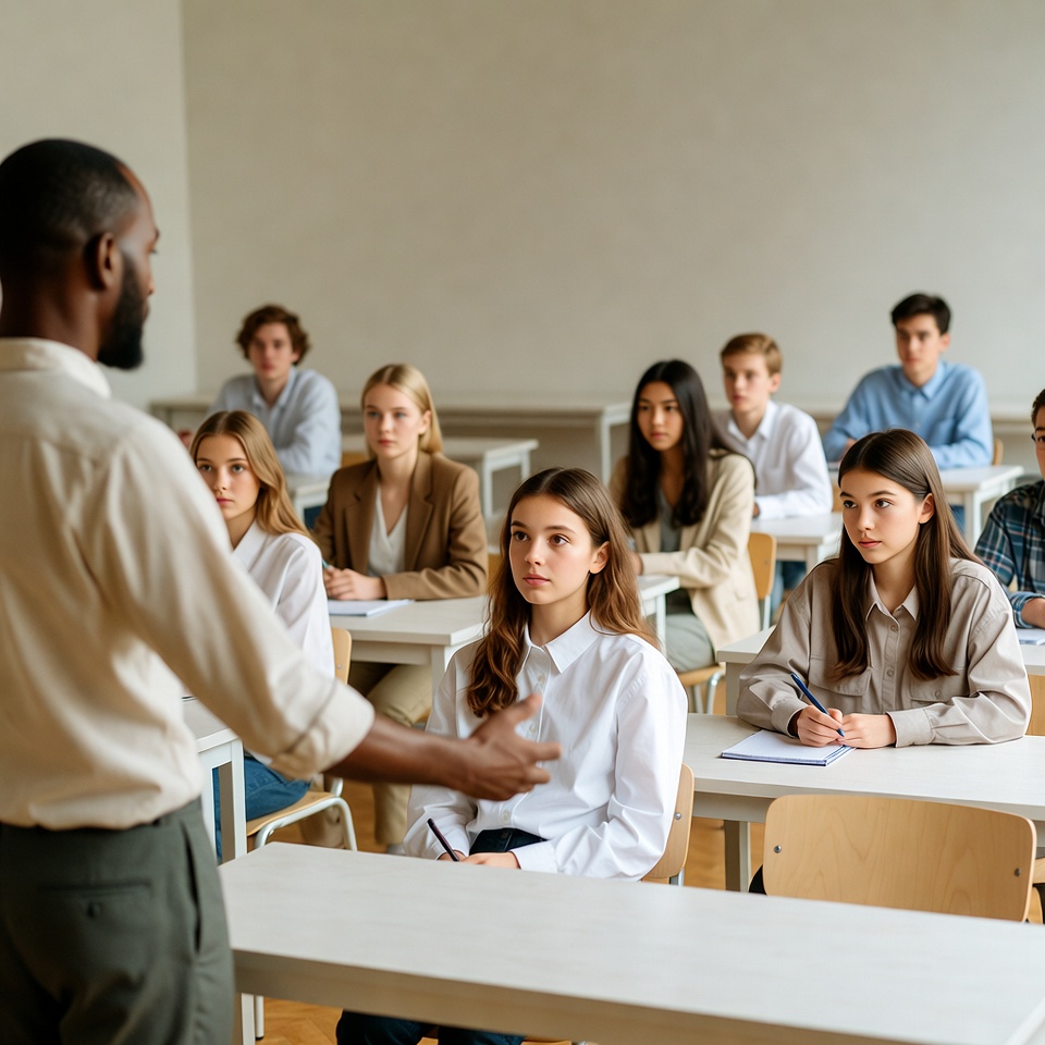 An African-American male teacher stands at the front of a classroom, gesturing with his hand while facing a group of attentive students seated at desks. The students, including White, Asian, and Multiracial girls and boys, sit in rows wearing school uniforms and holding notebooks or pens. The bright classroom features white walls, wooden desks, and chairs.