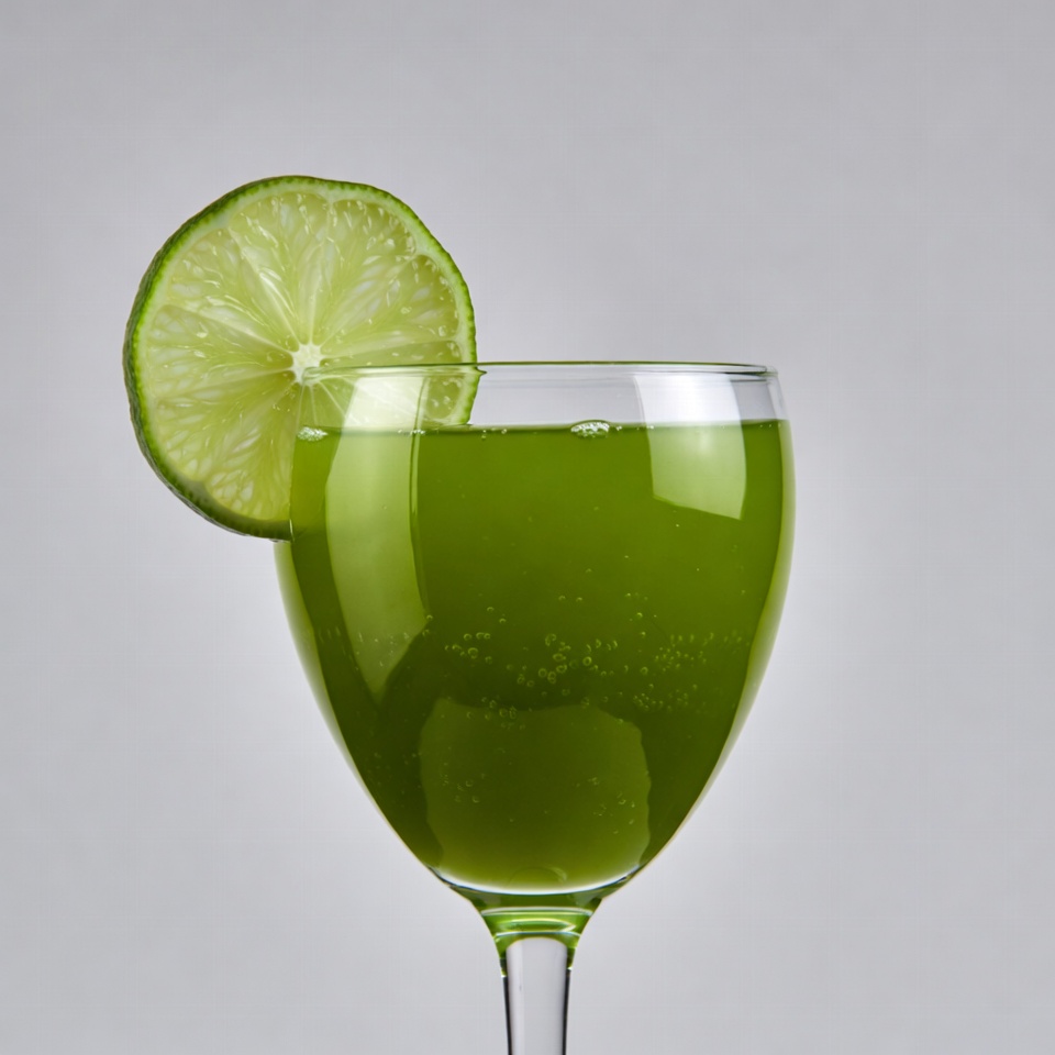 A clear glass filled with vibrant green liquid sits on a plain background. A fresh lime slice with visible pulp rests on the rim of the glass. Bubbles are visible in the effervescent green beverage.