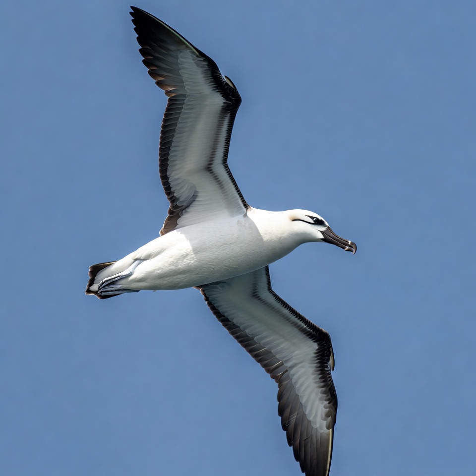 avian, bird, black wings, blue sky, flight, flying, isolated background, large bird, ocean bird, seabird, sky background, soaring, white bird, wings spread, albatross