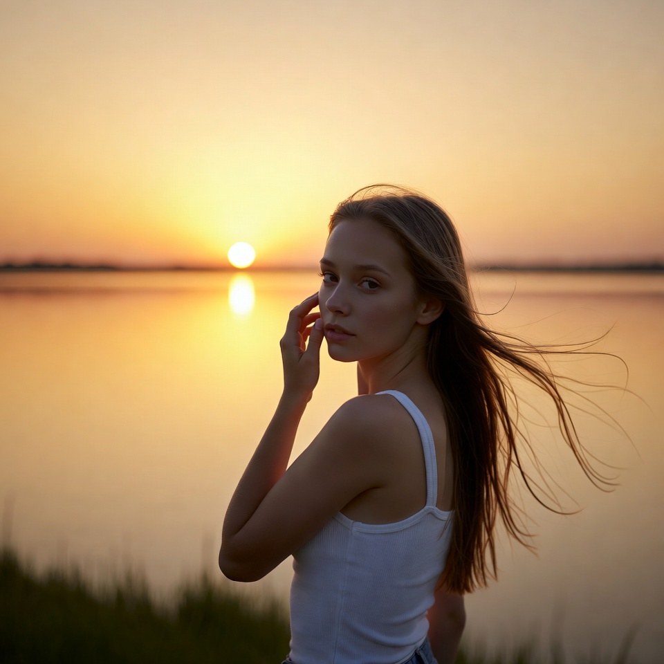 A young woman with long blonde hair stands by a lake at sunset, touching her face thoughtfully. She wears a white tank top and has wind-swept hair, with the sun setting behind calm waters and reeds in the foreground. Her profile is captured against the vibrant orange sky.