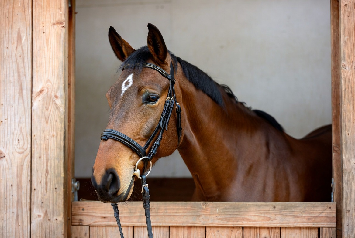 A brown horse with a white facial blaze looks out from a wooden stable stall. It wears a black leather bridle and stands against a white wall. The horse's head and neck are prominently visible through the open stall door.