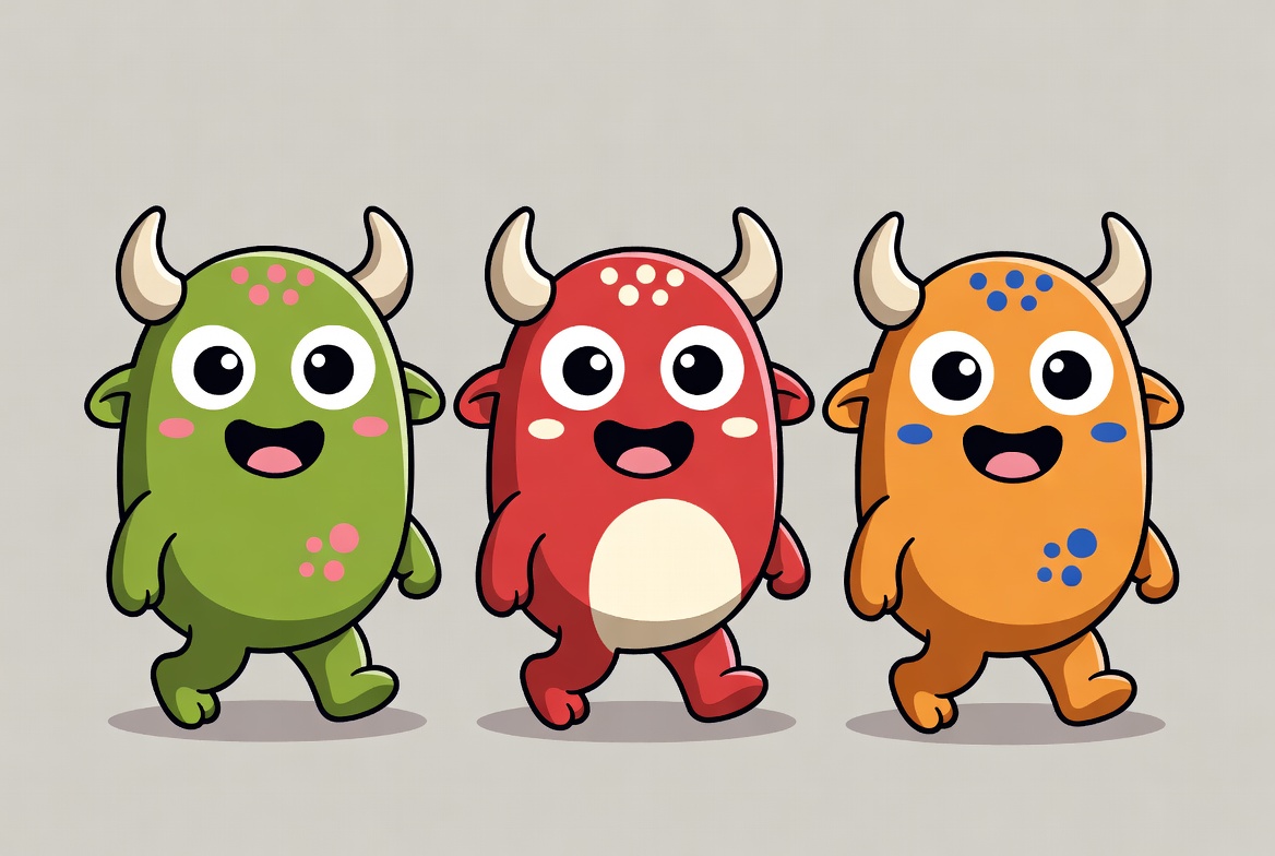 big eyes, clipart, colorful, cute monsters, digital art, friendly, fun, green monster, happy faces, horns, illustration, isolated background, kawaii, orange monster, red monster, smiling, spots, stubby arms, vector, walking, cartoon monsters