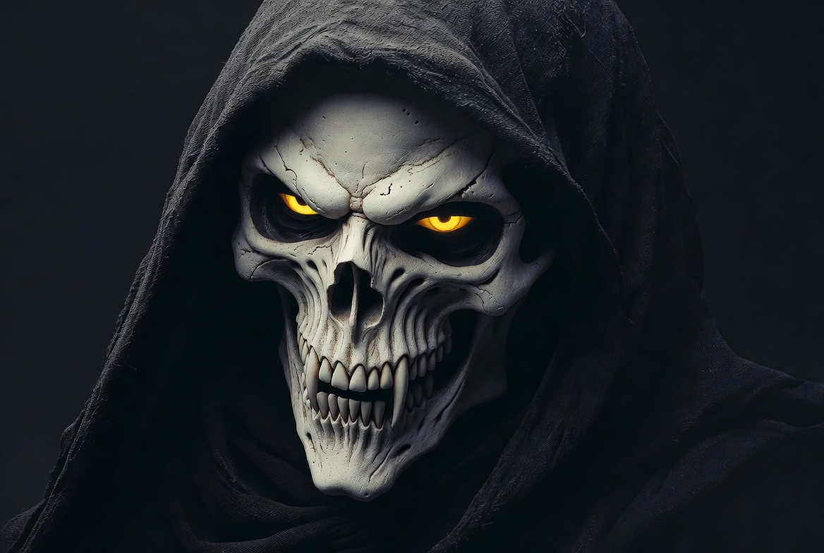 Halloween, cloaked skull, cracked skull, dark background, death, digital art, evil eyes, fangs, fantasy, glowing eyes, grim reaper, hood, horror, illustration, isolated background, menacing skull, skeleton, spooky, white skull, yellow eyes, skull