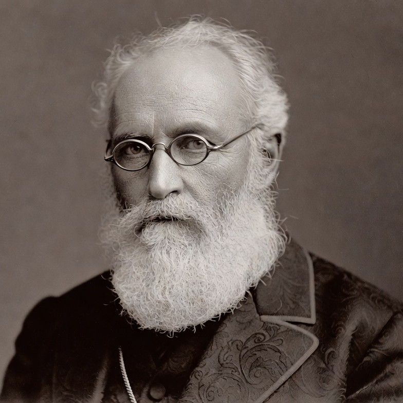 An elderly White man with a long white beard and curly white hair wears round glasses and a dark ornate suit jacket. He has a serious expression and faces the camera directly. The portrait is in sepia tone against a plain background.