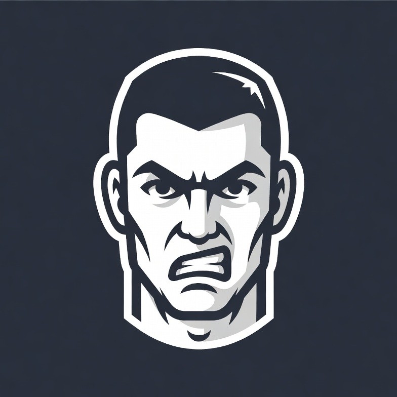 aggressive look, angry face, bold lines, cartoon face, clipart, dark background, emblem, fierce expression, furrowed brows, glaring eyes, graphic design, gritted teeth, headshot, illustration, intense stare, logo style, male, man, monochrome, navy background, portrait, short hair, snarling mouth, vector art, white outline, angry man
