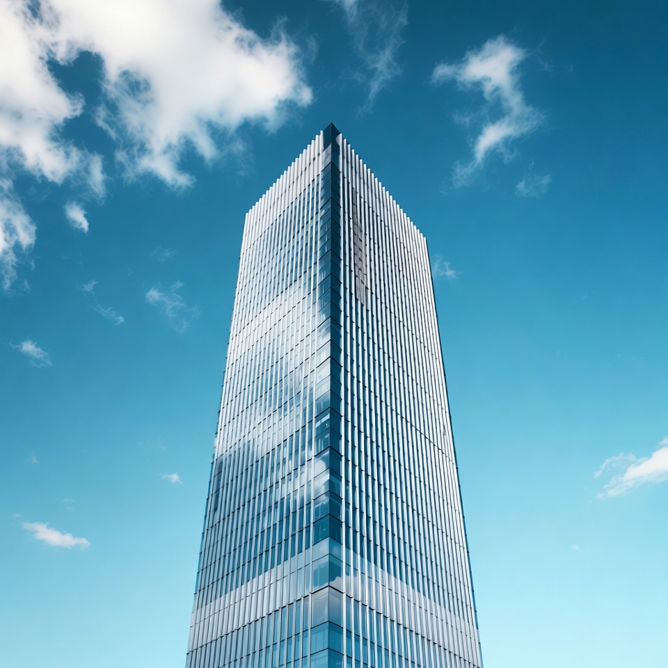 architecture photo, blue sky, city skyline, contemporary building, glass facade, high-rise, low angle, modern architecture, office tower, reflective glass, tall building, urban structure, vertical lines, white clouds, skyscraper