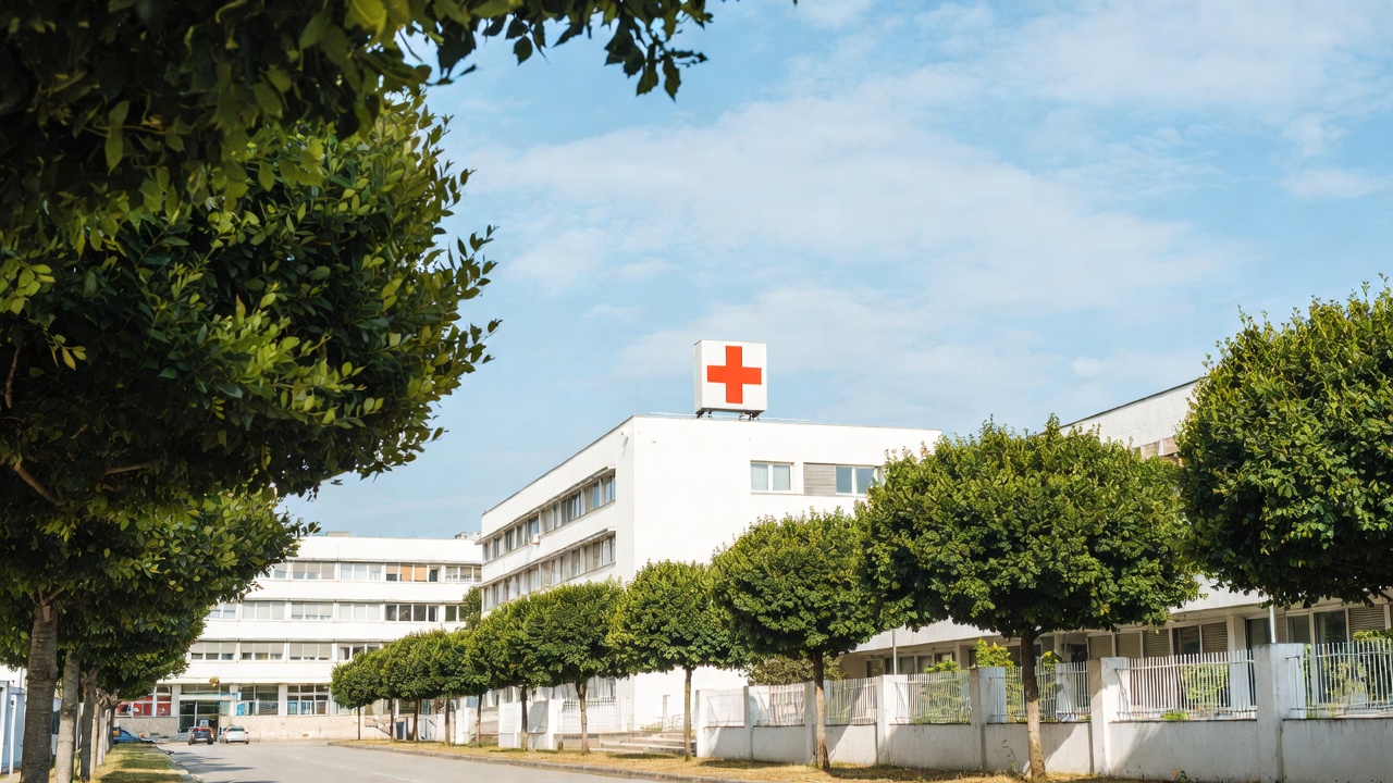 architecture, blue sky, building exterior, clinic, fence, green trees, healthcare facility, medical building, modern hospital, outdoor, red cross, road, sunny day, trees, white building, hospital