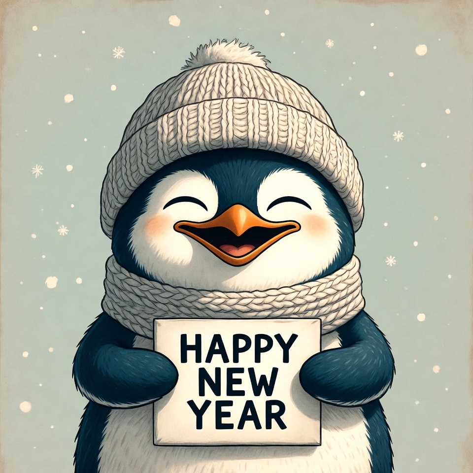 An adorable illustrated penguin with a white knitted beanie and matching scarf holds a sign reading 'HAPPY NEW YEAR'. The penguin has a big smiling face with rosy cheeks and is surrounded by falling snowflakes on a vintage beige background. The artwork features a soft, textured style with fluffy details on the penguin's feathers.