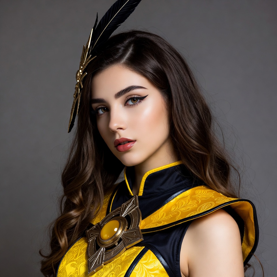 A young woman with long dark wavy hair wears an elaborate yellow and black cosplay costume with gold accents and a large black feather headpiece. She has dramatic eyeliner and pink lips, posing against a gray background. The outfit features intricate embroidery, a high collar, and a prominent gold medallion on her chest.