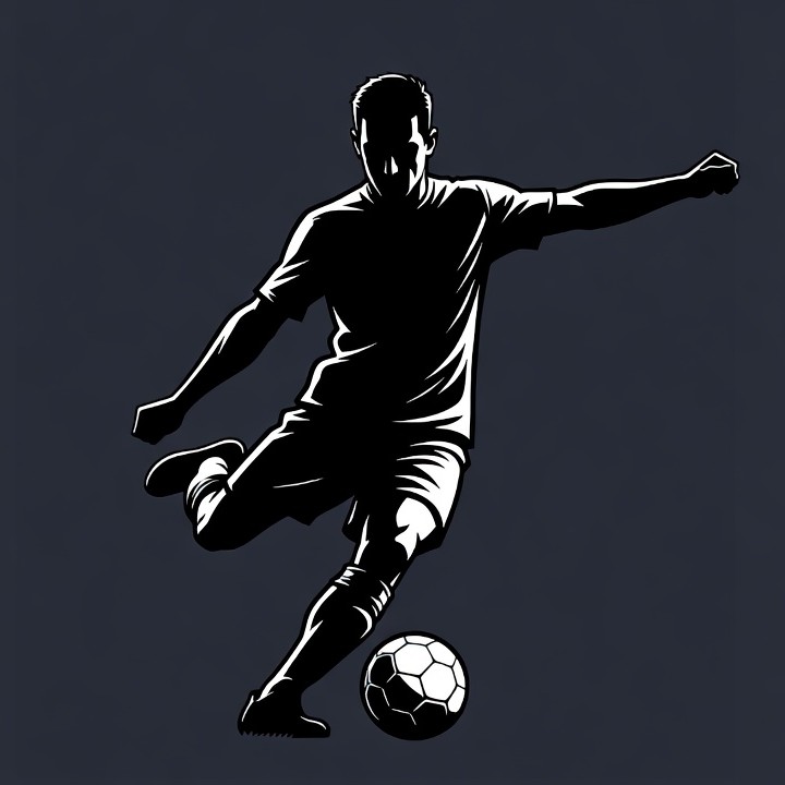 A black silhouette illustration of a male soccer player dynamically kicking a soccer ball. He wears a jersey, shorts, and cleats, captured mid-action with one leg extended. The image features a dark navy background with white highlights on the figure and ball.