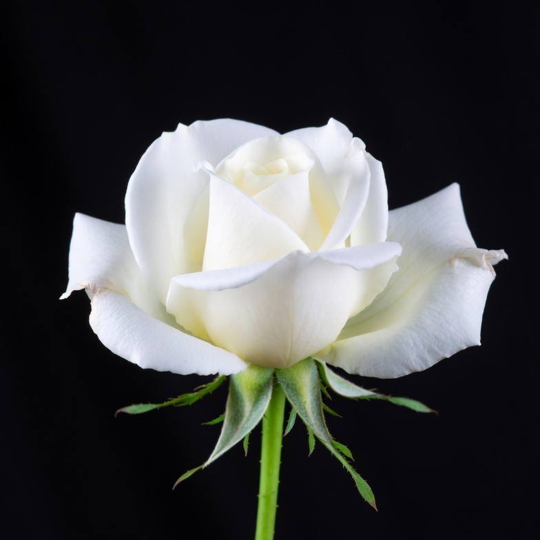 beauty, black background, bloom, closeup, elegance, floral, flower, green leaves, green stem, isolated, nature, petals, plant, rose, white flower, white rose