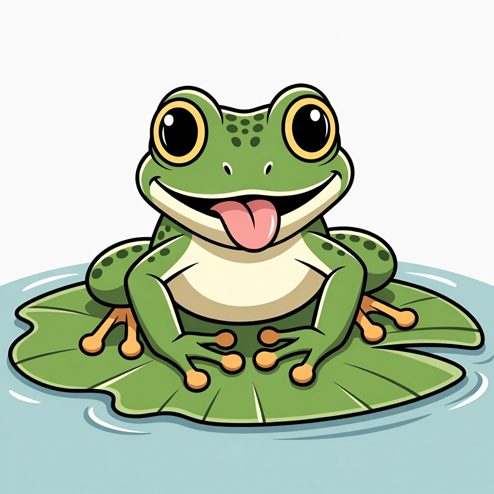 A cute green cartoon frog with big yellow eyes sits smiling on a large green lily pad. Its orange tongue sticks out playfully, and its front legs rest on the pad's edge. The background features light blue water with subtle ripples.