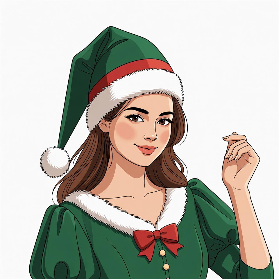 Christmas elf, White, brown hair, cartoon illustration, elf costume, female, green dress, green elf hat, illustration, isolated background, red bow, smiling woman, white fur trim, elf woman