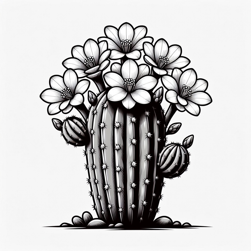 A detailed black and white line art illustration of a tall cactus with multiple blooming flowers. The cactus has textured spines and small side buds, with large flowers opening at the top. It stands on a rocky ground against an isolated white background.