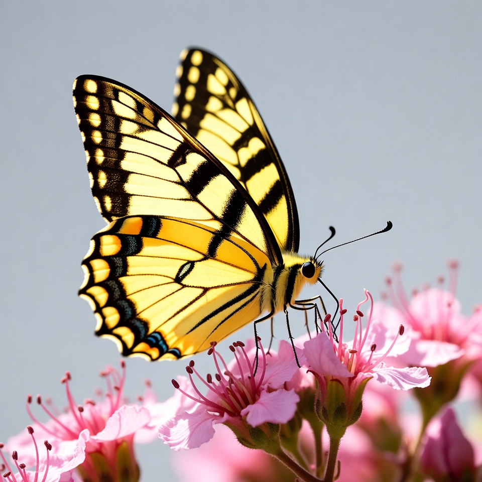 A vibrant yellow butterfly with black stripes perches on a cluster of pink flowers. Its wings feature distinctive tiger-like patterns and orange accents. The butterfly is isolated against a light gray background.
