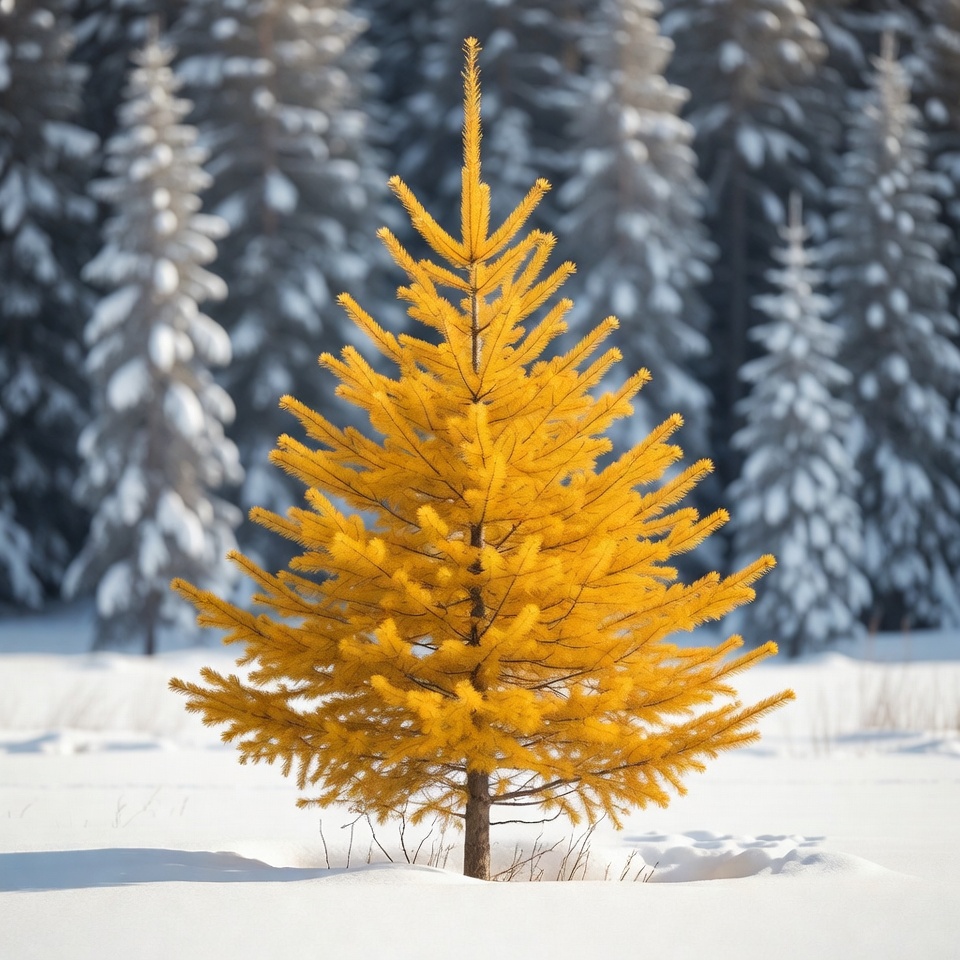 A vibrant golden yellow pine tree stands prominently in a snowy landscape surrounded by snow-covered evergreen trees. The tree's bright yellow needles contrast sharply against the white snow and dark forest background. Snow blankets the ground around the base of the tree.