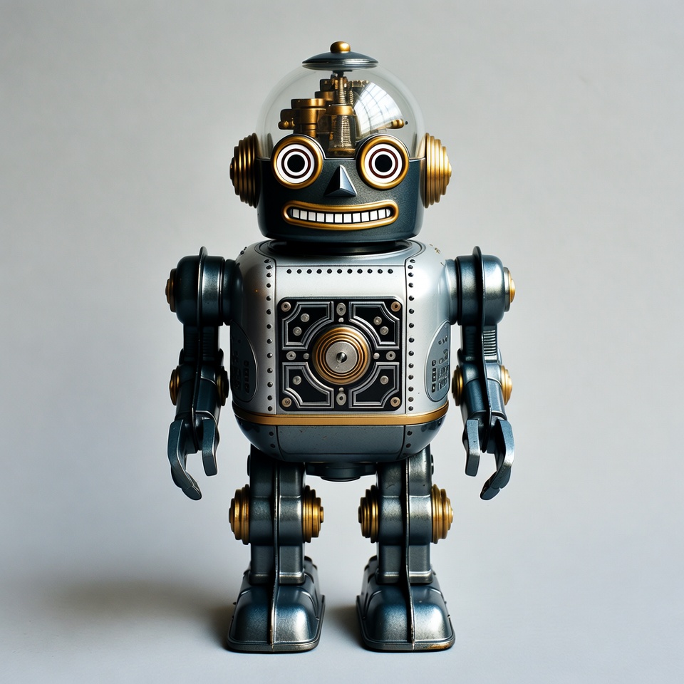brass gears, cartoon eyes, glass dome, gold robot, gray robot, isolated background, mechanical robot, metallic robot, retro robot, robot toy, smiling robot, steampunk robot, toy robot, vintage robot, robot