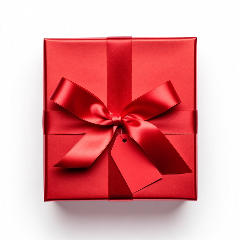 A shiny red gift box sits on a white background, topped with a large red satin bow. A red gift tag hangs from the bow. The box is viewed from directly above.