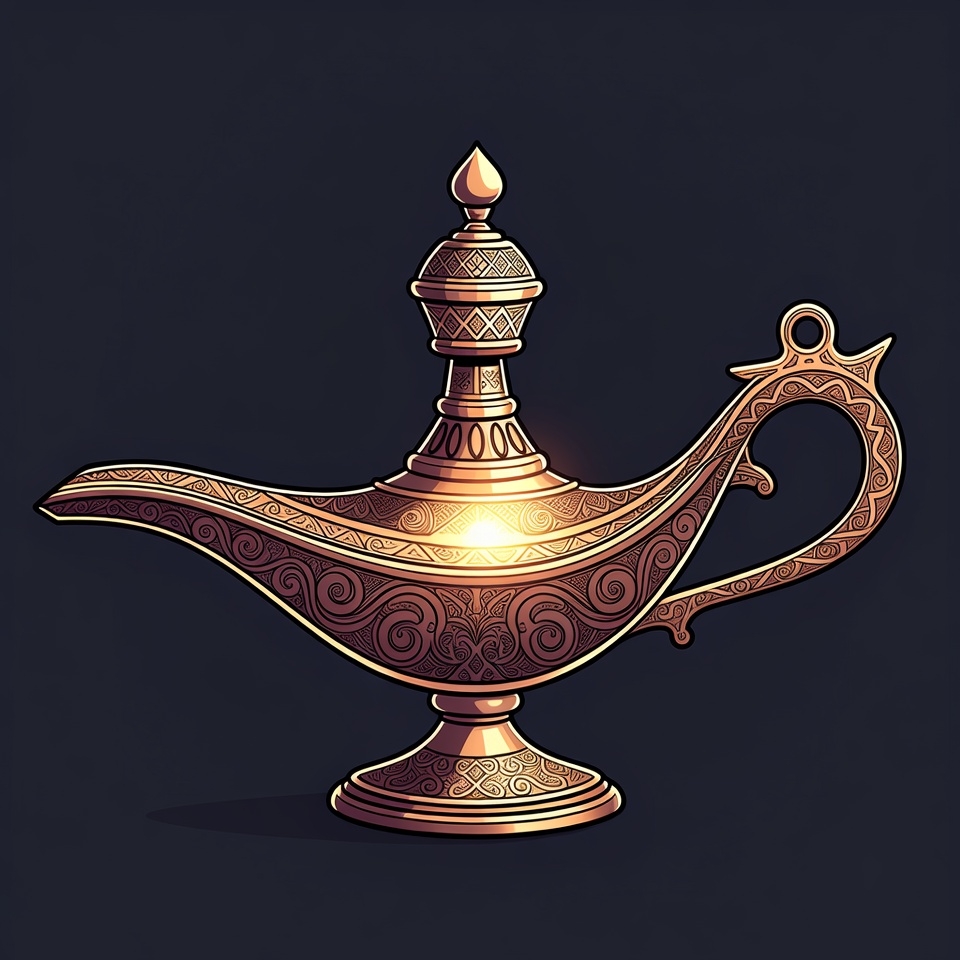 arabian lamp, brass lamp, clipart, curved spout, dark background, digital art, domed lid, fantasy lamp, glowing lamp, golden lamp, illustration, intricate patterns, isolated background, lamp handle, magic lamp, metallic texture, ornate design, vintage lamp, genie lamp