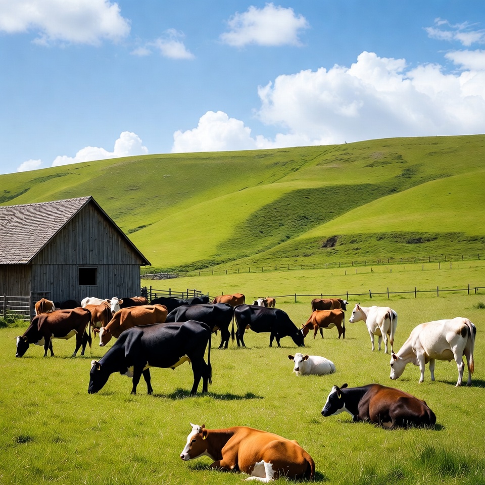 A herd of various cows including black, white, brown, and spotted ones graze and rest on lush green grass in a fenced pasture. A wooden barn stands nearby under a clear blue sky with scattered white clouds. Rolling green hills extend in the background.