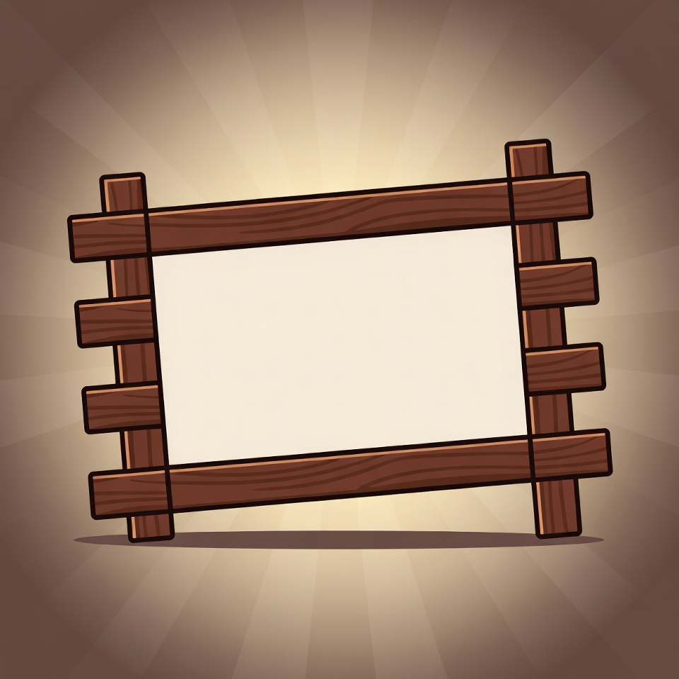 A cartoon-style wooden picture frame with a blank white center is tilted at an angle. It features thick brown wooden planks and crossbars on a glowing beige background with radiant light effects. The frame has a playful, illustrated design suitable for holding images or messages.