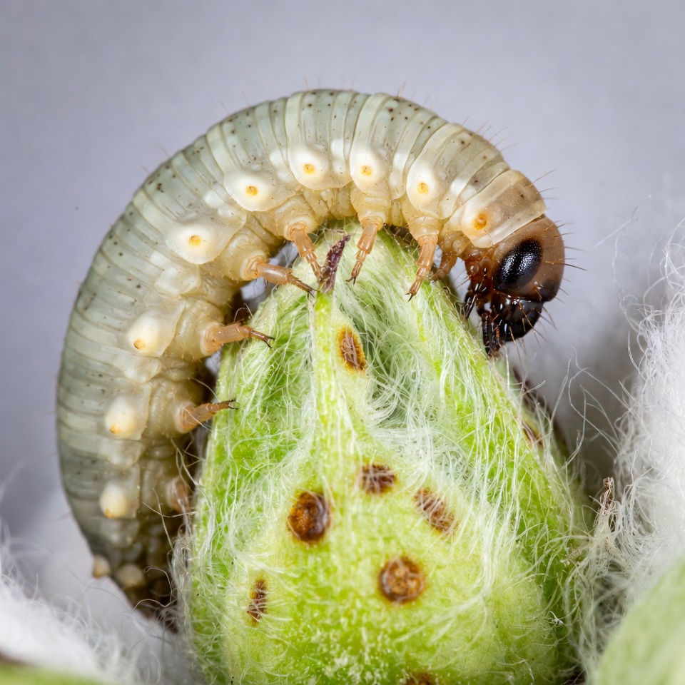 agriculture, arthropod, bollworm, brown head, close-up, cotton boll, crop, eating, feeding, green caterpillar, insect, larva, macro photography, nature, pest, plant, segments, white fibers, wildlife, caterpillar