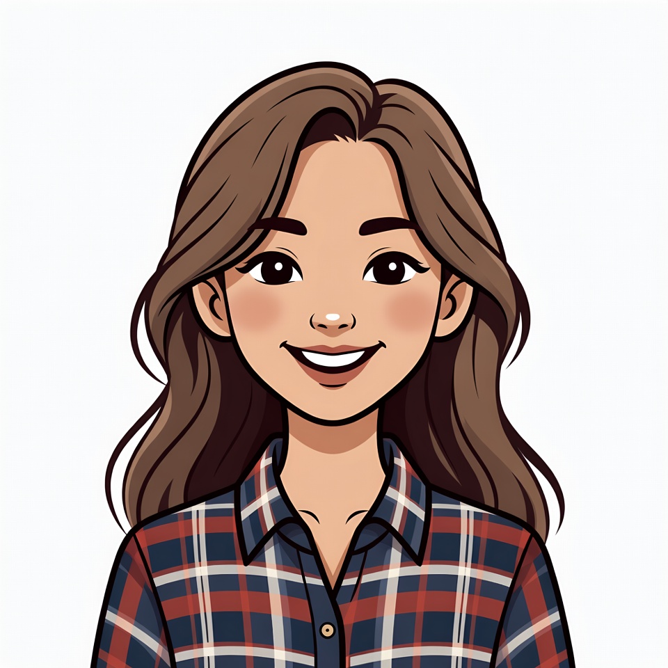 A cute cartoon illustration of a young Asian woman with long wavy brown hair smiling happily at the viewer. She has large expressive eyes, rosy cheeks, and wears a collared red and navy plaid shirt. The character is depicted on a plain white background.