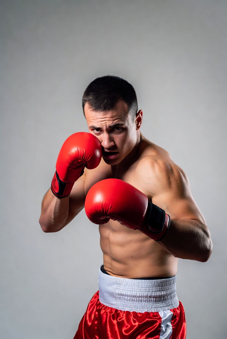 A muscular man with short dark hair stands in a boxing stance wearing red boxing gloves and shiny red shorts with white trim. His upper body is bare, showcasing defined abs and arms, against a plain gray background. He gazes intently forward with gloves raised in fighting position.