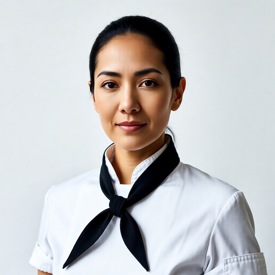 A young Asian woman with long black hair in a bun smiles at the camera. She wears a white chef jacket with a black neckerchief tied neatly around her collar. The portrait is set against a plain white background.