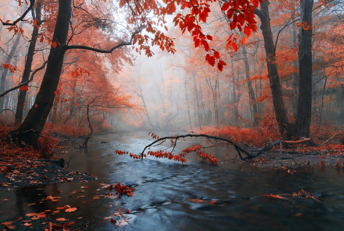autumn nature, autumn trees, autumn woods, fall colors, fall foliage, fall forest, foggy forest, foggy morning, foggy trees, forest river, forest scenery, forest stream, leaf covered ground, misty path, misty woods, nature landscape, nature scene, orange foliage, orange trees, red autumn, red branches, red leaves, river stream, seasonal forest, tall trees, vibrant leaves, woodland path, woodland stream, autumn forest