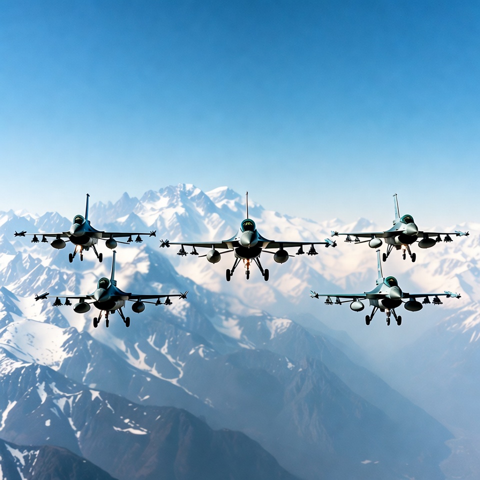 aerial view, air force, aviation, blue sky, combat jets, fighter jets, flying jets, high altitude, jet formation, jet squadron, military aircraft, mountain range, snowcapped peaks, snowy mountains, F-16