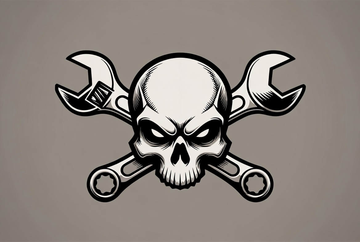 A bold black and white skull illustration features two large wrenches crossed behind it. The design has thick outlines and a menacing expression with prominent teeth and eye sockets. It is set against a plain gray background.