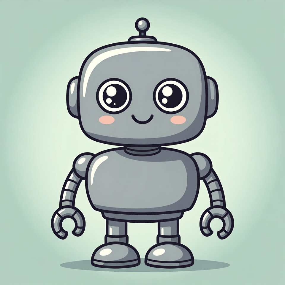 A cute gray robot with big sparkling eyes and a happy smile stands on a light green background. It has a rounded body, antenna on top, and simple mechanical arms and legs. The illustration features bold outlines and a kawaii style.