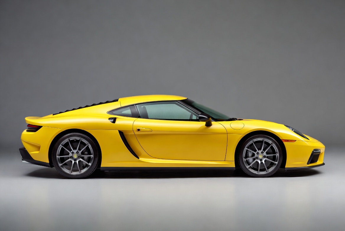 718 Cayman, GT4 RS, German car, aerodynamic, alloy wheels, black rims, brake calipers, coupe, isolated background, low profile, luxury car, performance vehicle, race car, rear wing, side view, sleek design, sports car, supercar, tinted windows, yellow car, yellow paint, Porsche