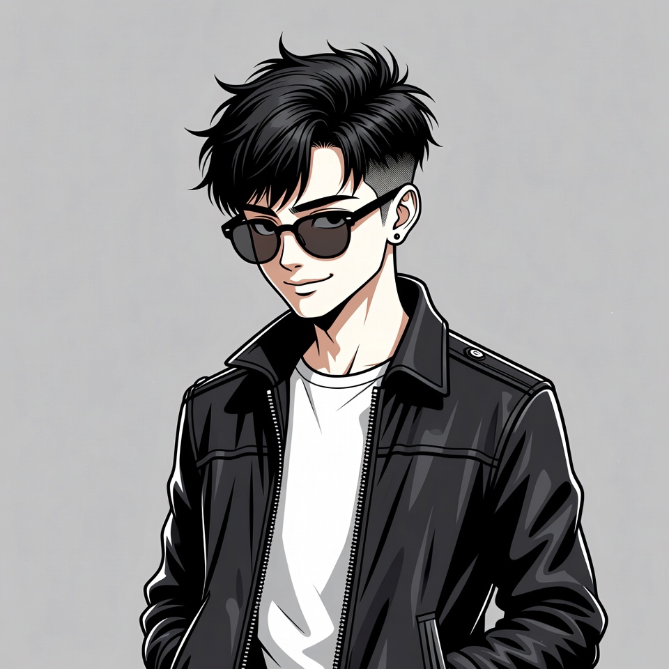 An anime-style illustration of a young Asian boy with spiky black hair, wearing dark sunglasses and a subtle smile. He has an undercut hairstyle and a small earring in one ear. He is dressed in a black leather jacket over a white t-shirt, standing confidently against a plain gray background.