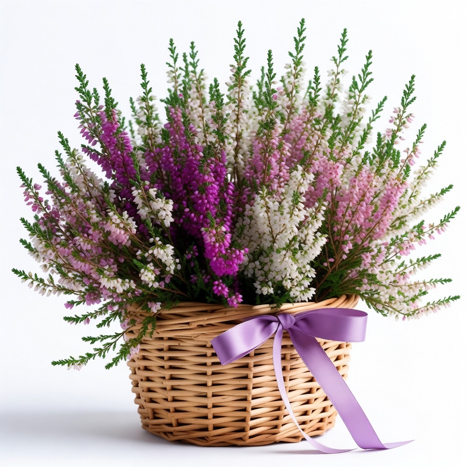 A woven basket holds a lush bouquet of heather flowers in shades of purple, pink, and white. A purple ribbon is tied around the basket. The arrangement is displayed against a plain white background.