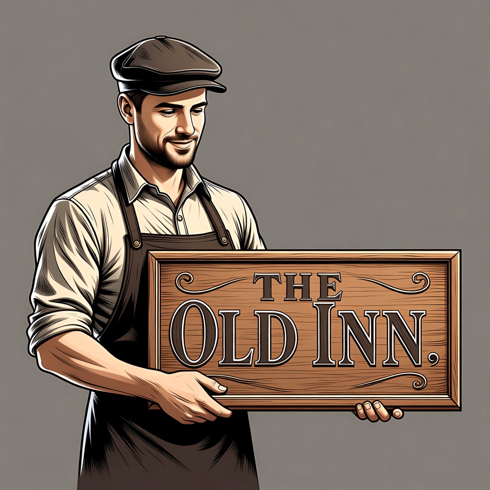 An illustrated man with short hair and a flat cap wears a white shirt and brown apron. He holds a wooden sign reading 'The Old Inn' with ornate lettering. The image features a gray background.