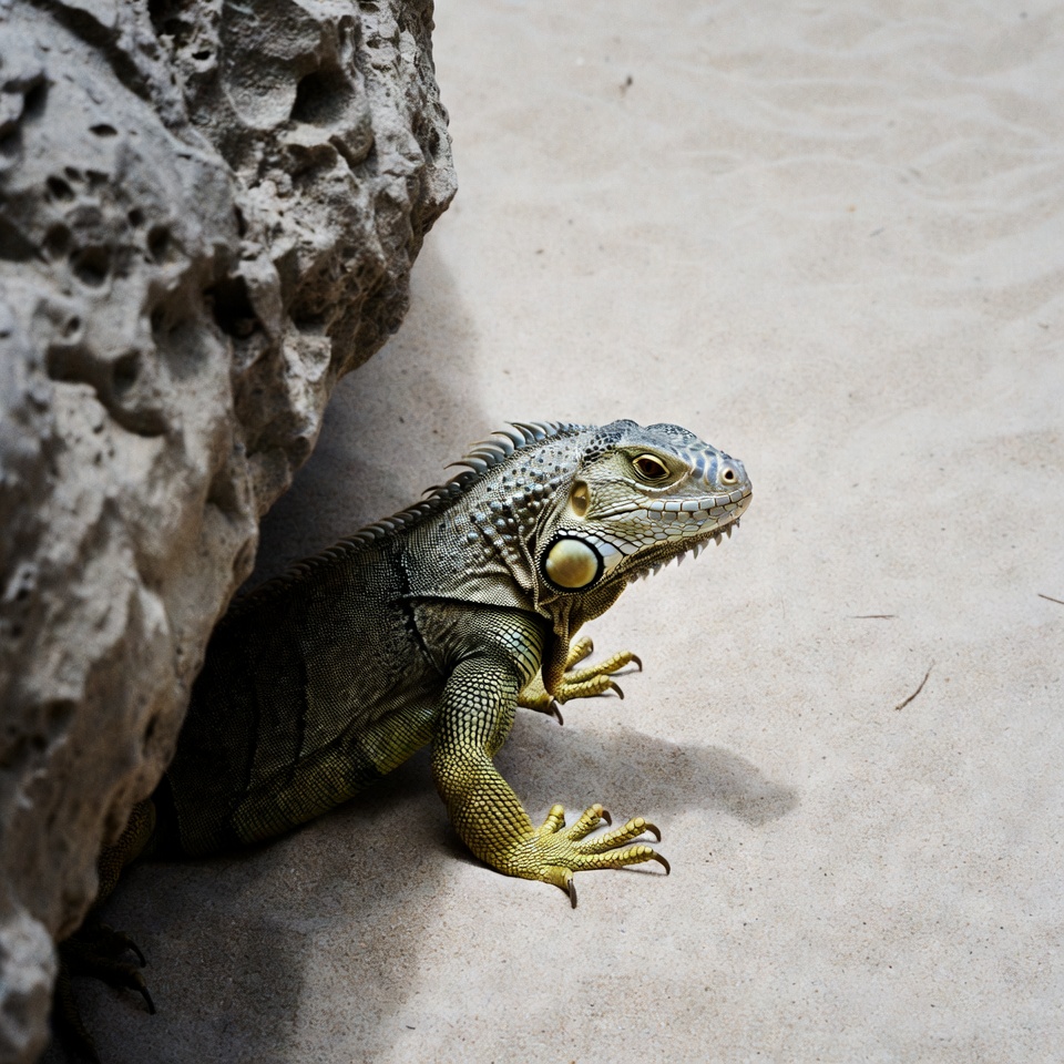 A green iguana with yellow legs hides partially behind a large textured rock on sandy ground. Its head protrudes forward with prominent dewlaps and sharp claws visible. The reptile's scales and spines are detailed against the light-colored background.
