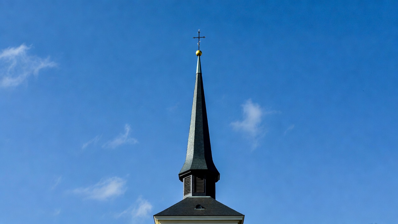 architecture, blue sky, building, christian, church tower, clouds, cross, golden cross, outdoors, religion, religious symbol, sky, spire, steeple, tall spire, tower, church steeple