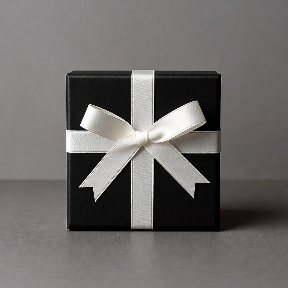A sleek black gift box is wrapped with a large white satin ribbon tied into a bow. The box sits centered on a smooth gray surface. The ribbon's tails drape elegantly over the sides.