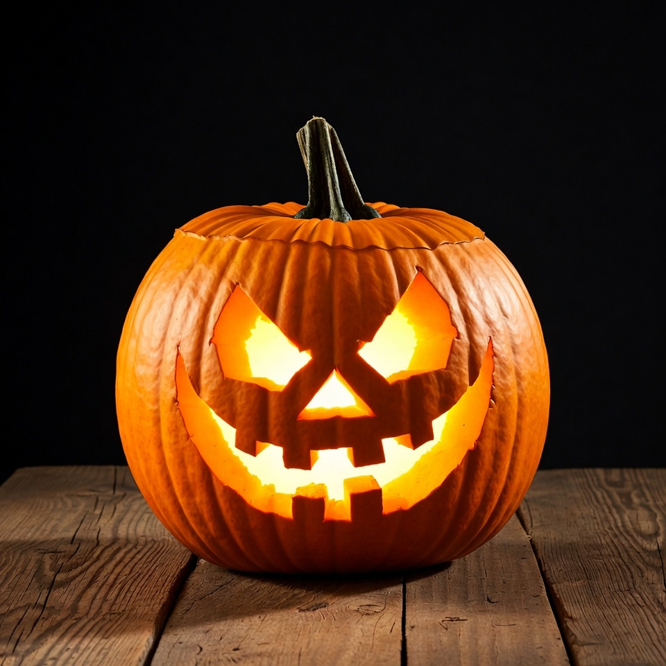 A carved pumpkin with glowing orange eyes, nose, and jagged smiling mouth sits on a wooden table. The jack-o'-lantern's interior light creates an eerie Halloween face against a dark background. The pumpkin has a short stem on top.