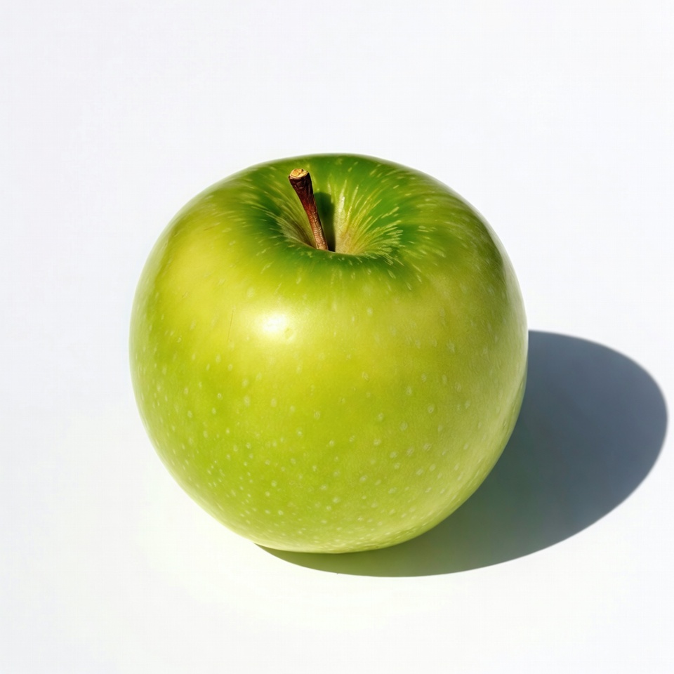 A fresh green apple with a short brown stem sits centered on a plain white background. The apple's smooth surface features subtle green speckles and a glossy shine. A soft shadow falls to the right, adding depth to the isolated fruit.