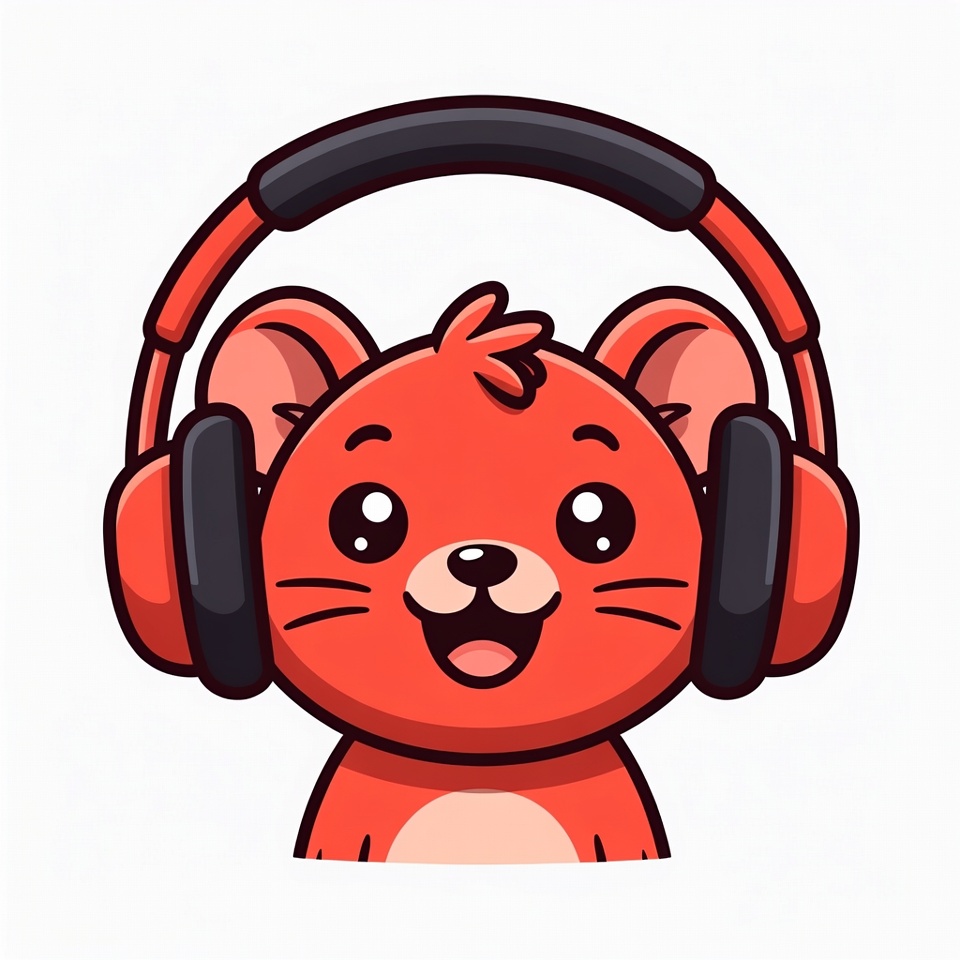 adorable animal, animal, big eyes, cartoon mouse, chibi mouse, clipart, fluffy mouse, happy mouse, headphones, illustration, isolated background, kawaii mouse, music mouse, pink ears, red headphones, red mouse, smiling mouse, vector art, cute mouse