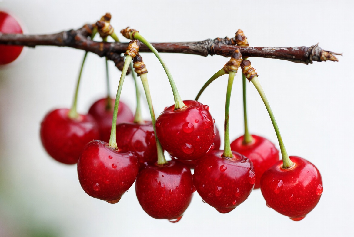 Clusters of ripe red cherries hang from thin brown stems and branches. Dew drops glisten on the shiny cherries and leaves. The cherries are photographed against a plain white background.