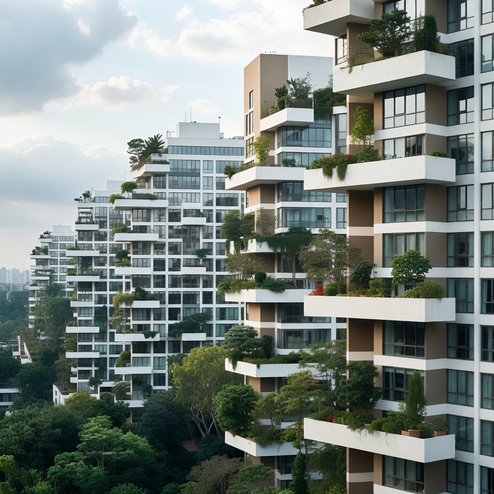 aerial perspective, apartment complex, balconies, beige facade, cityscape, cloudy sky, eco-friendly, foliage, green balconies, greenery, lush plants, modern architecture, multi-story, outdoor plants, residential towers, rooftop garden, sky view, sustainable design, trees, tropical plants, urban landscape, vertical garden, white buildings, high-rise buildings