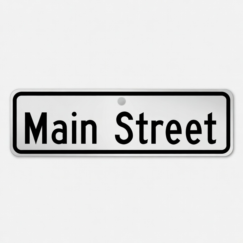 A rectangular white street sign with black bold text reading 'Main Street'. The sign features a hanging hole at the top and is isolated on a plain background.