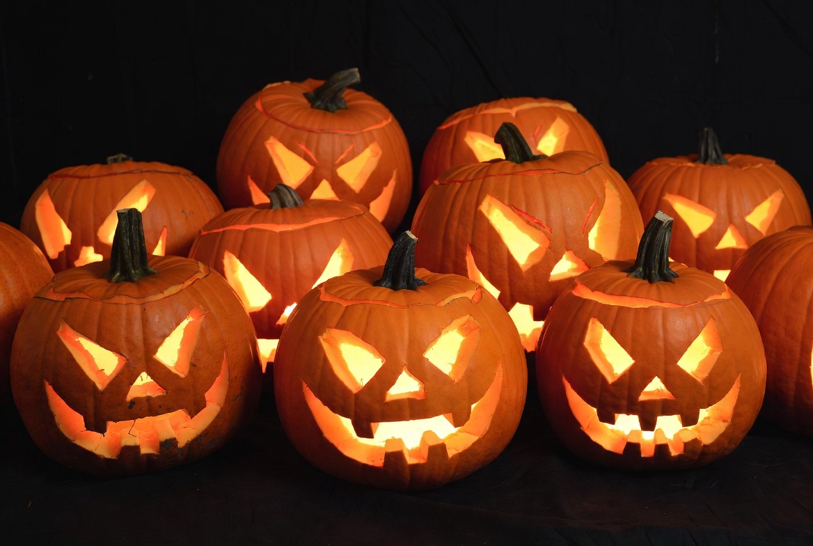 Halloween, Halloween decoration, arrangement, autumn, black background, candlelight, carved pumpkins, cluster, fall, glowing faces, isolated background, jagged eyes, lit pumpkins, orange pumpkins, pumpkins, spooky, toothy grins, jack-o-lantern